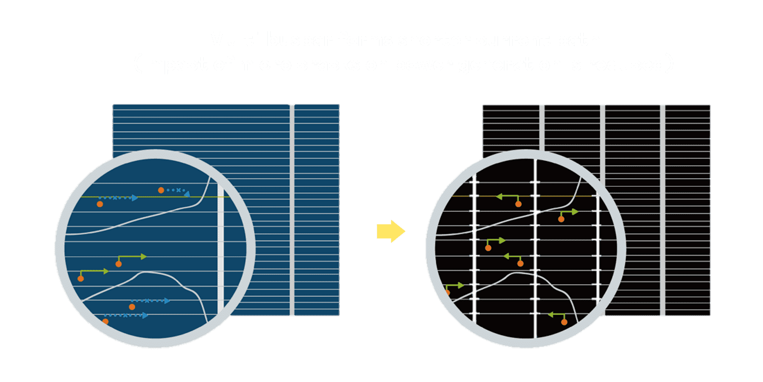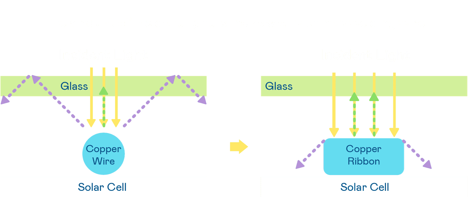 • 电池使用多条铜导线 (Copper wire) 于电池片上形成较短的电流路径,,,,提高电流收集效率,,采用圆形设计的铜导线较传统扁平式的铜焊带 (Ribbon),,,,可增加入射至电池的光线量。。